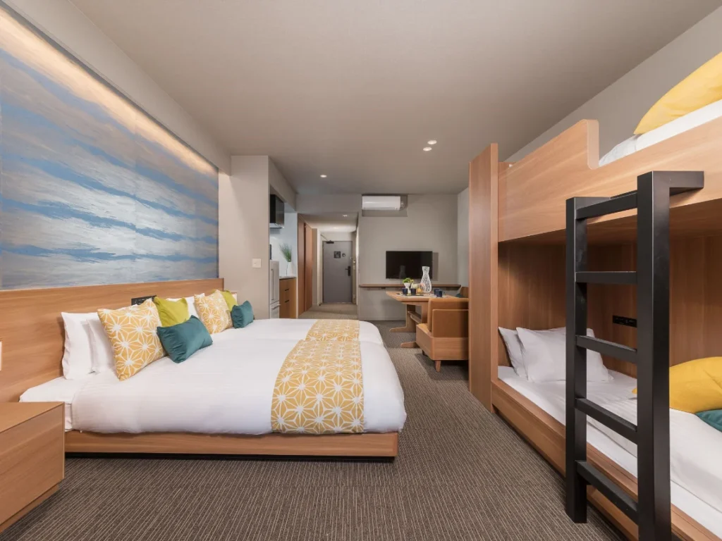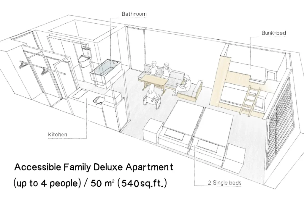 The hotel offers several room types, all designed around the idea of staying in a furnished apartment rather than a standard hotel room. The Family Apartment and Pokémon Room each accommodate up to four guests, while the Apartment 5 Singles can sleep five. Larger groups can book the Family Deluxe or the Connecting Family, which joins two rooms. There is also an Accessible Family Apartment designed for wheelchair users.