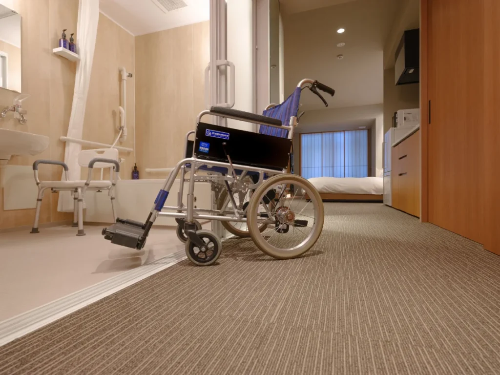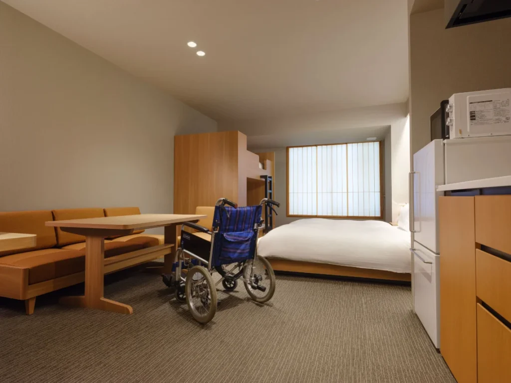 MIMARU Kyoto Kawaramachi Gojo is fully barrier-free throughout the building. The entrance uses automatic doors with a 150 cm opening width, and the interior is flat from the lobby through to the elevators and guest room floors. There is a 5 cm step on the pavement just outside the building entrance, but the entrance itself is level.