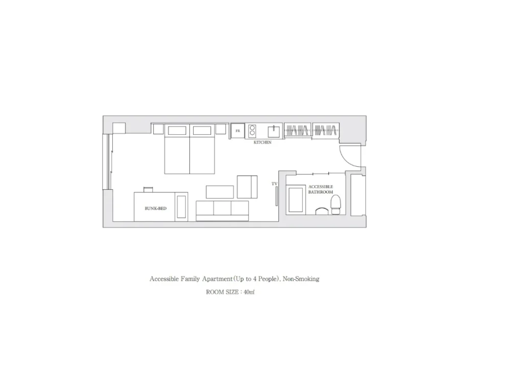 The Accessible Family Apartment is a 43 sqm non-smoking room that sleeps up to four guests in two single beds and one bunk bed, with a kitchen and dining area included. The room entrance has a swinging door with an 85 cm width and only a 0.5 cm threshold. Beds are 200 cm by 100 cm with a height of 30 cm from the floor to the mattress. Bedside clearance is 70 cm, and there is space under the beds (10 cm or more) for a portable hoist.