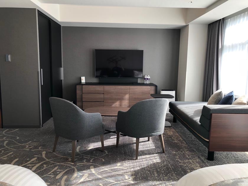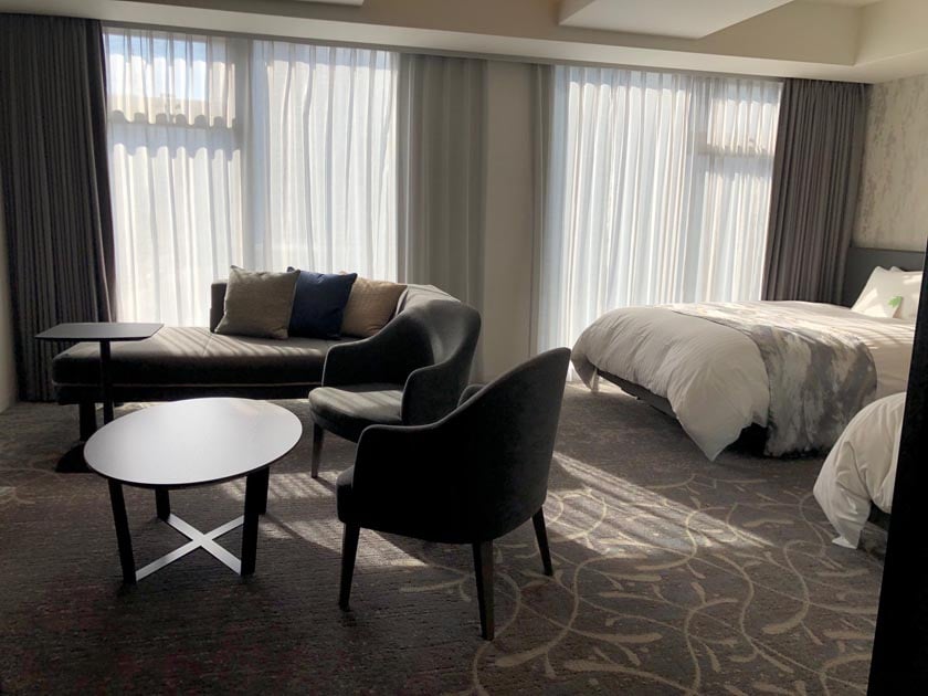 Hotel Vischio Kyoto by Granvia has a Universal Twin room with two beds, a sitting area, a wide entry door, and large sliding doors opening to an accessible bath and toilet rooms.