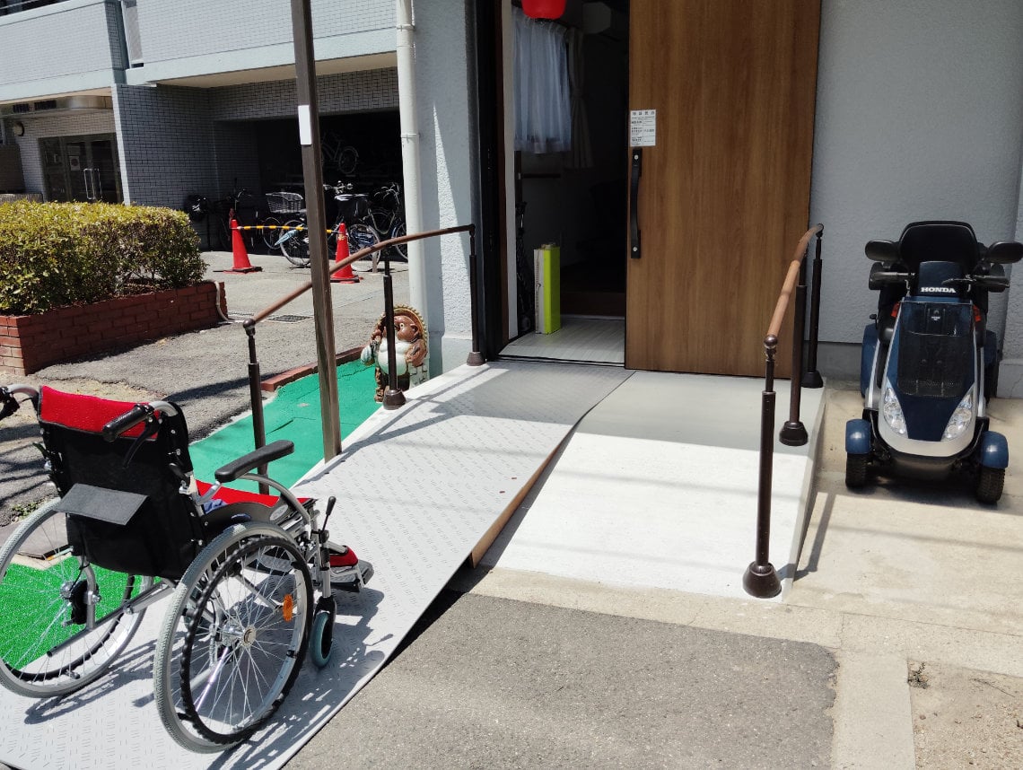 This ground-floor guesthouse in Osaka offers a private stay for up to four guests, with one queen bed and two single beds. The layout separates the wheelchair user’s space from the companion’s room, which has direct access to a bathroom and shower, plus its own back entrance.