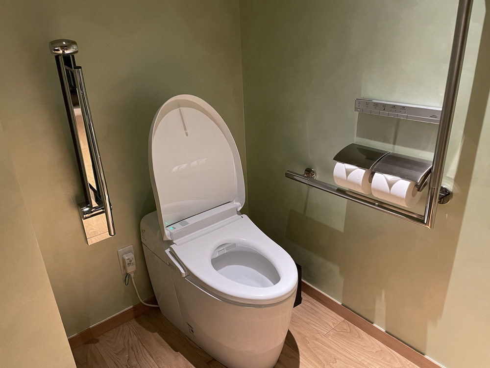 The guest floor common areas are flat and have space to move around in a wheelchair. The hotel has 3 “Yuri”-type accessible rooms, located on the lower floors of the hotel. Accessible rooms cannot be booked online and must be booked by contacting the hotel directly. The doors slide open and have a button to lock/unlock the door inside the room. There is plenty of room in the bedroom area, including space between the bed and wall. The bed is lower than many other hotels, but not too low. There is no room for a hoist legs under the bed.