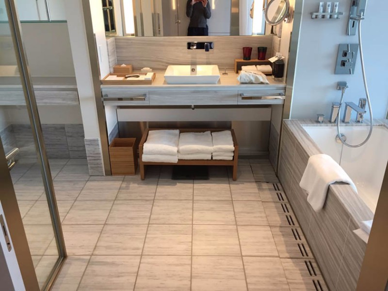 This is an American brand hotel of the luxury type so rooms are quite large by Japanese standards. Depending on your disability, a regular room may accommodate your needs. For those who require more space or have specific needs, the hotel has one twin deluxe with a bit more space enabling you to transfer from wheelchair to bed/ toilet/ shower chair. Note that the toilet does not have a back. The shower chair can be put in to the tub but as sides of tub are high this may not work but you can use the showerchair beside tub as there are drains in floor to accommodate this.