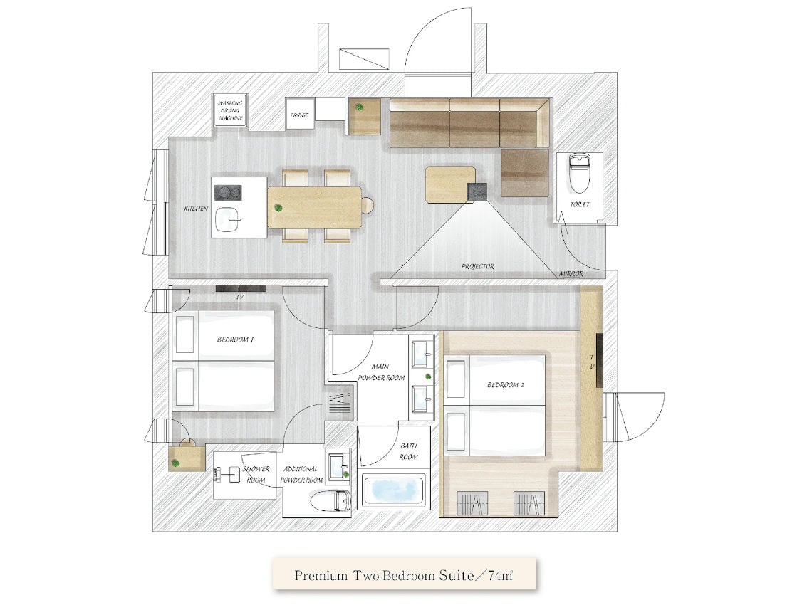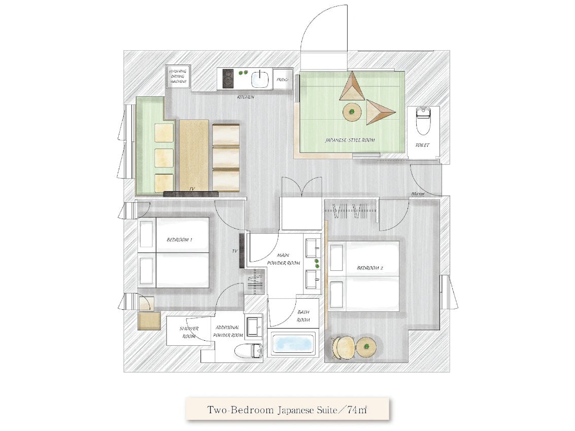 Upon entering your MIMARU suite, you’ll find a fully furnished kitchen and dining area, equipped with everything from an IH stove and cookware to a refrigerator and tableware. The thoughtful inclusion of a washer/dryer in every room ensures that your stay is as seamless as it is enjoyable – and you can fill your suitcase with souvenirs instead of dirty laundry. As the suites are designed for families and groups, there are two bedrooms, two showers (one ensuite to the main bedroom, the other with a bathtub), and two powder rooms. To make your stay feel even more like home, the front desk has many items available to be borrowed – from high-end rice cookers to Apple TV streaming boxes. (The front desk service is available from 7AM to 10PM. There will be security staff during the night for guest’s security.)