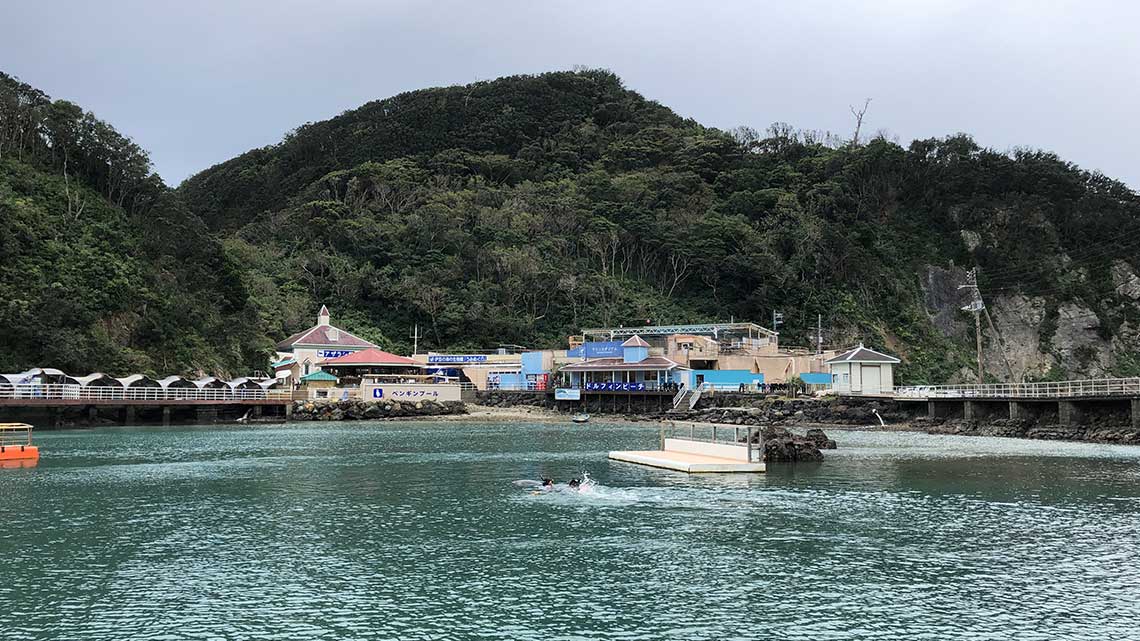 The aquarium consists of 3 main areas connected by floating docks surrounding a small bay where dolphins swim freely.