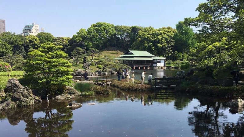 The pond contains three islands – one of which is connected by a bridge – and is home to many carp and turtles. Since it is close to Tokyo Bay, the garden also attracts many birds. A traditional style restaurant is located on the pond (by reservation only). There are over 4000 trees in the relatively small garden. Though mostly Japanese Black Pine, different flowering trees provide seasonal colors throughout the year.