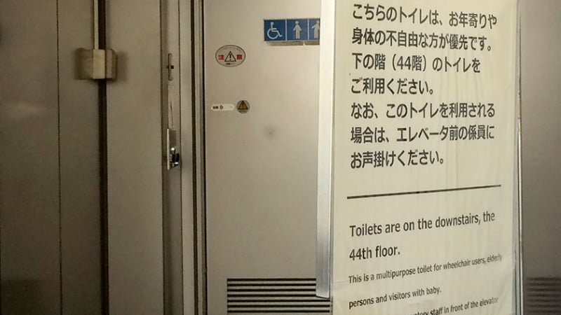 Being a government building, the accessibility of Tokyo Metropolitan Government Building is very good. It is built like a regular office building, so there is no special fanfare other than a bag check at the bottom of the elevator. It doesn’t get too crowded and it is easy to navigate the stores. Both towers have an accessible toilet near the elevator on the 45th floor. It is roped-off to ensure that it is only used by those who need it. There is a staff member nearby at all times that will remove the rope. Returning to the ground floor, the elevator typically stops on the 2nd floor, however this leads to an escalator so the staff at the top of the elevator will instruct you to get off at the first floor instead.