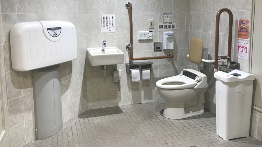 While there is a wheelchair accessible washroom available further back in the building, the area is blocked off on regular weekdays. You may be able to convince a guard to let you back there, but it may be easier to just use the washrooms at the train station or Edo-Tokyo Museum – both located next to the Ryogoku Kokugikan. The small Kyu-Yasuda Teien Gardens are nearby as well.