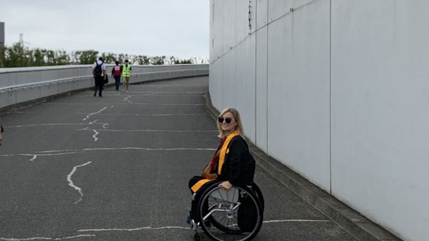 Getting to Nissan Stadium in Yokohama was also relatively easy. We took a shinkansen from Tokyo Station directly to Shin Yokohama Station and from there it was about a 10-minute roll through the town, which was crowded with spectators, but sidewalks were in good condition and easy to roll on. After going through the gate and security, we had another long ramp to navigate, similar to the one at Tokyo Station, to get to our seats. There were large crowds gathered just outside the stadium before the game, but the crowds inside the stadium seemed to be more spread out at this match and easier to get through. The seating situation was a bit different at this stadium with the wheelchair and companion seats stacked together. My partner had to sit behind me and our Japanese companions were next to us in the same configuration. We were in the corner of the field and had a great view though! Bathrooms and getting food were much easier at this stadium, in comparison to Tokyo Stadium. The bathroom, a single, was quite large and located right near our seats. There were also more food options available so much shorter, accessible lines.