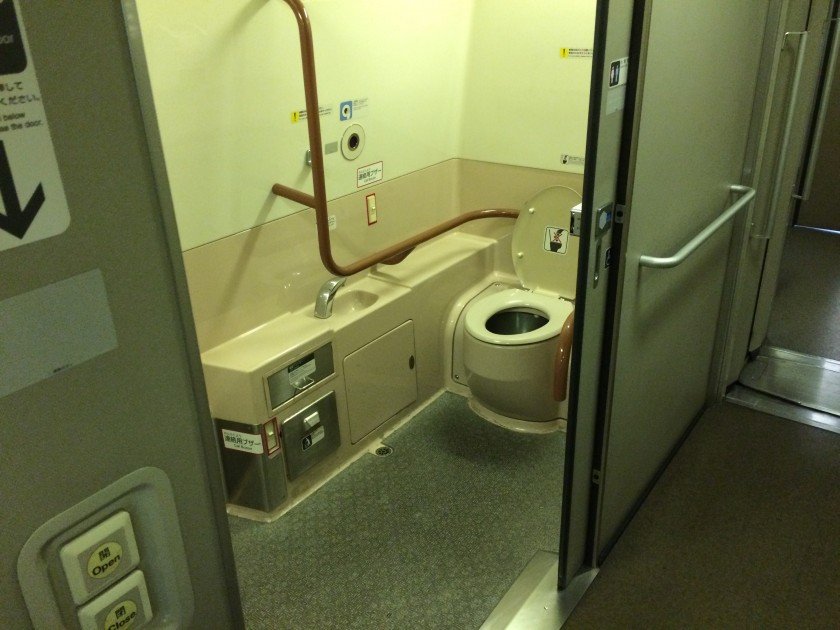 Another reason you will want to get a reserved seat is because the wheelchair accessible toilet is located in the same train car as the accessible seating! While not huge, considering the space restrictions, it is big enough. Unfortunately, when you get in, you will be facing the toilet, requiring a 180° turn in a cramped space. But it sure beats the alternative!