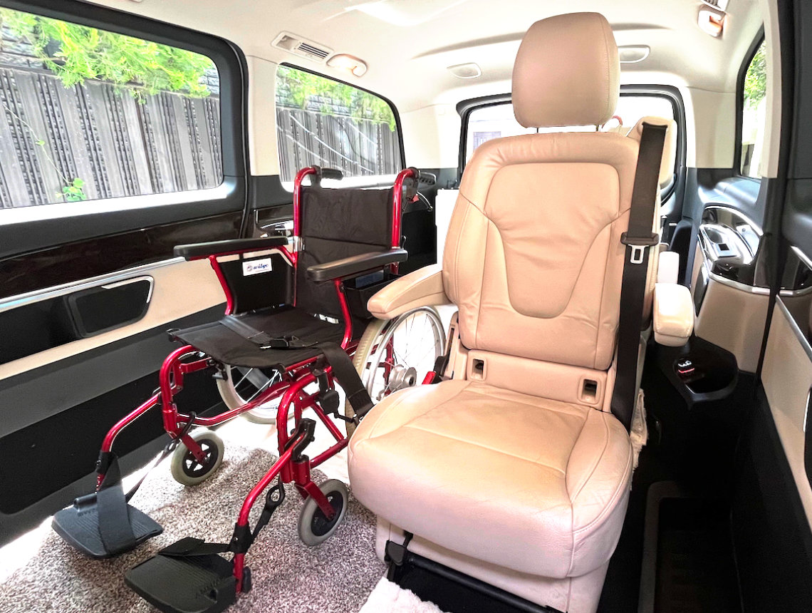 Jun’s vehicle is a Mercedes MPV that’s converted to accommodate a wheelchair and 3 passengers together with space for several large suitcases.