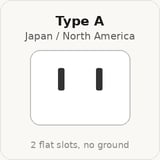 The outlets use Type A plugs: two flat parallel pins, no ground pin. They look almost identical to North American outlets, except there’s no third hole for a ground prong.